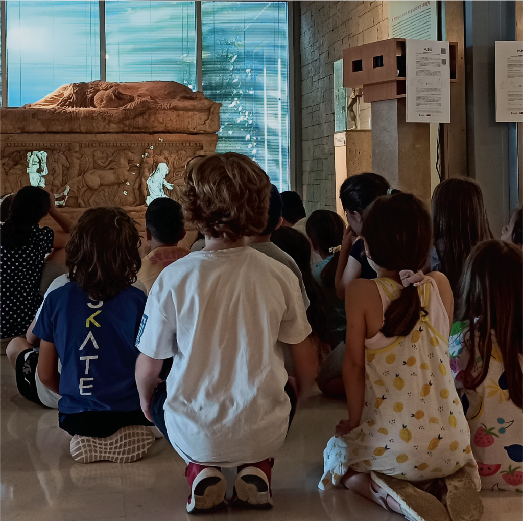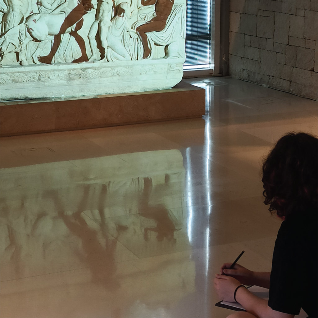 Η ψηφιακή προβολή εστιάζεται στη μαρμάρινη ρωμαϊκή σαρκοφάγο από το Λαδοχώρι Θεσπρωτίας (αρ. ευρ. ΑΜΙ 6176), κεντρικό έκθεμα στην αίθουσα της ρωμαϊκής περιόδου του Μουσείου.