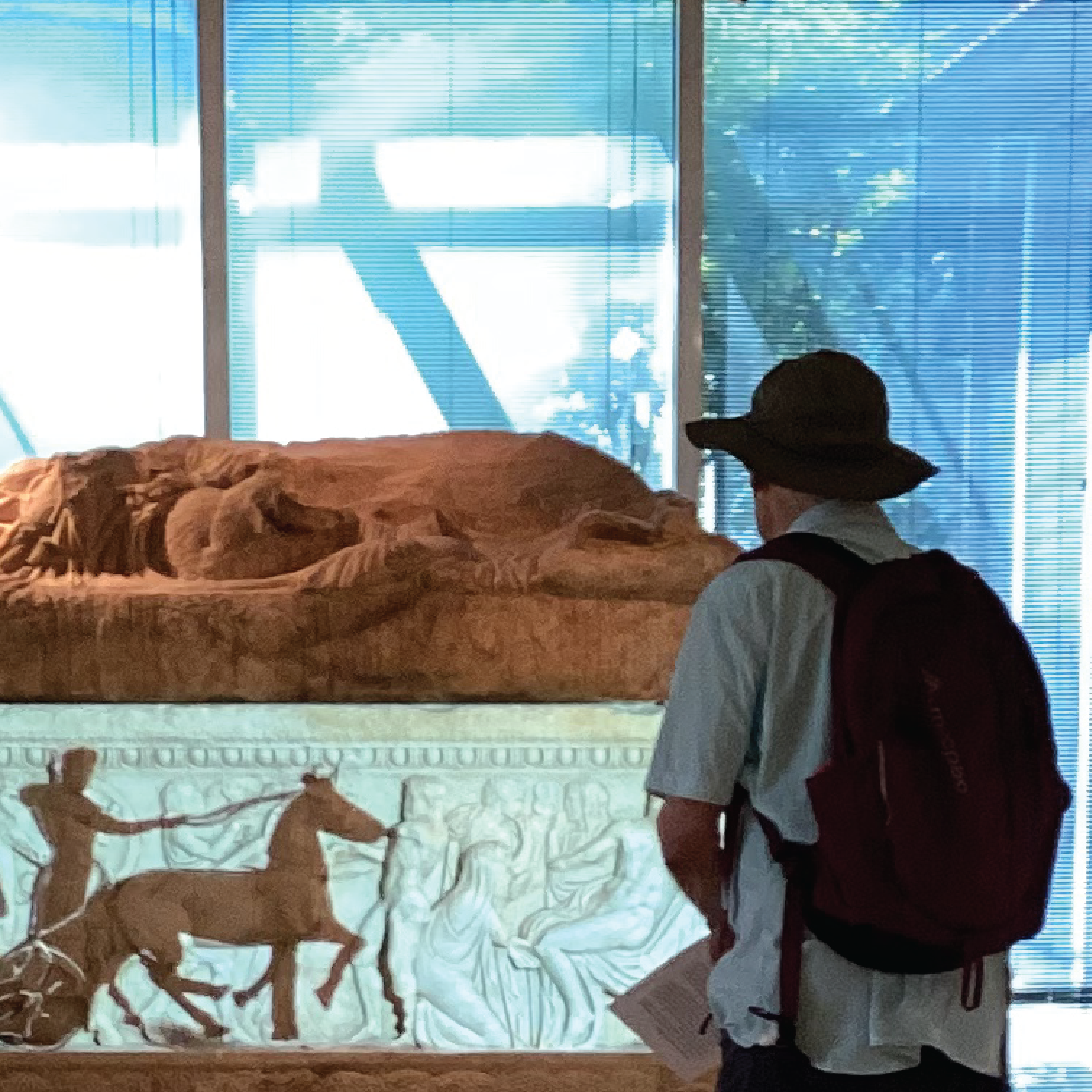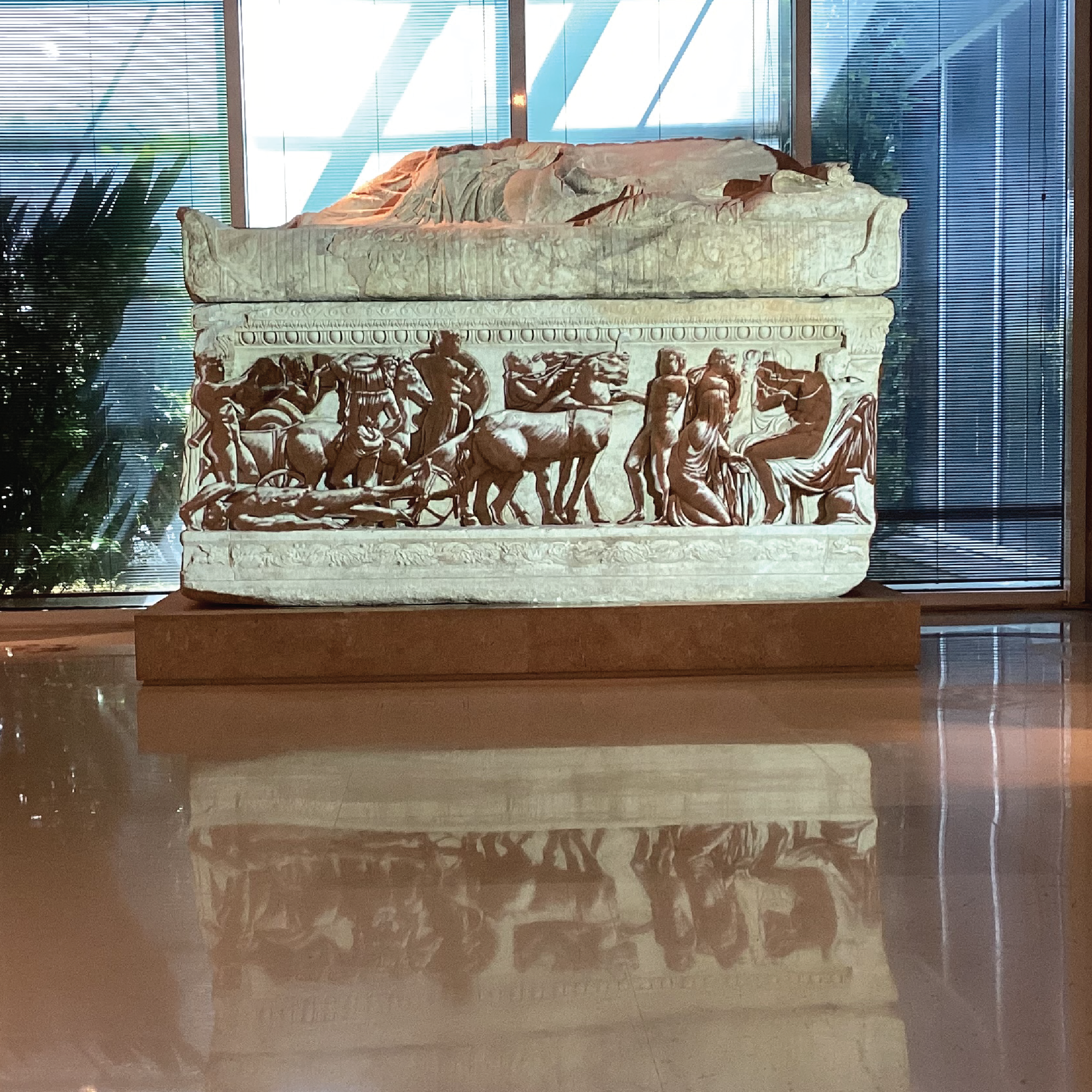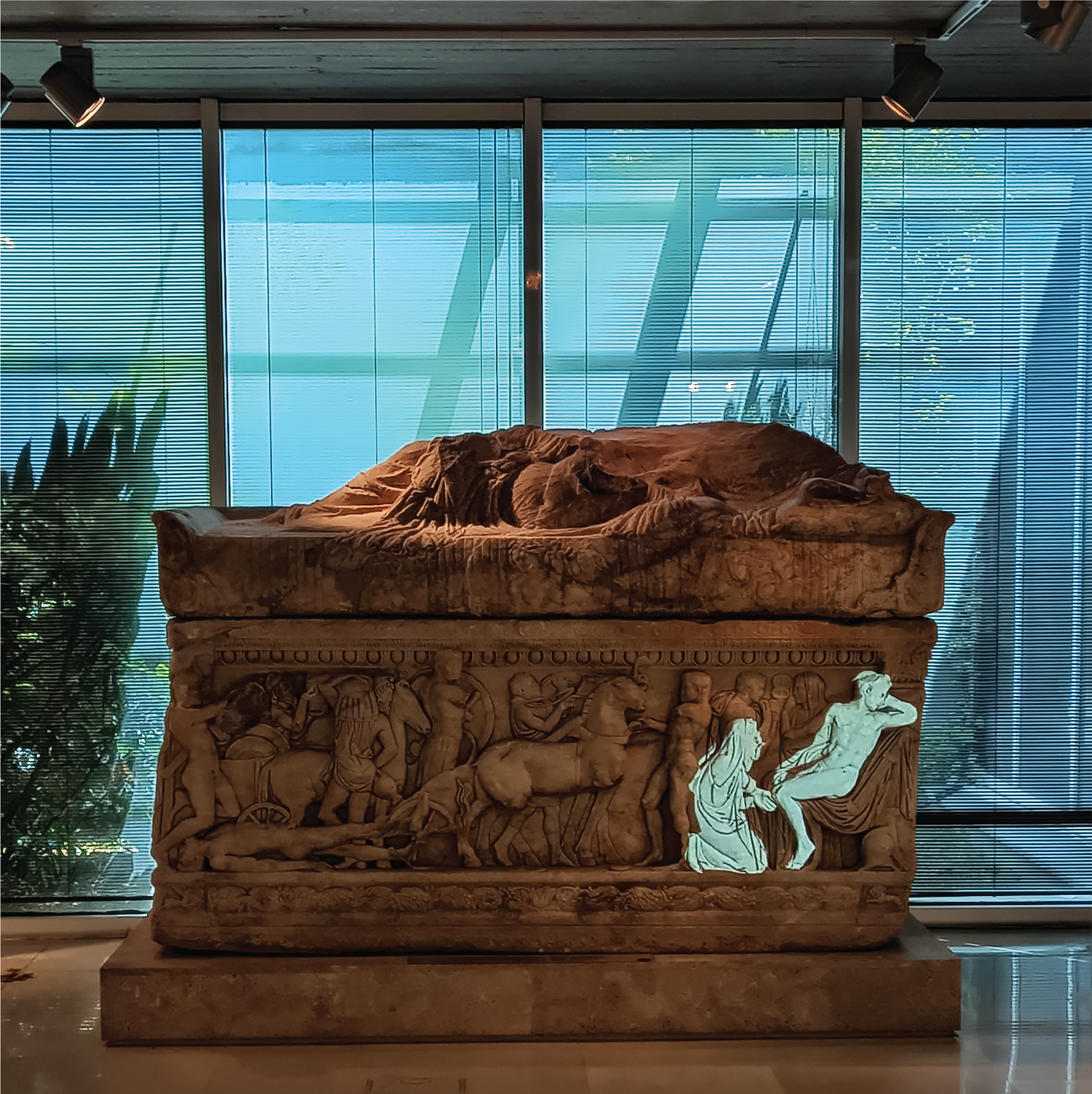 Η ψηφιακή προβολή εστιάζεται στη μαρμάρινη ρωμαϊκή σαρκοφάγο από το Λαδοχώρι Θεσπρωτίας (αρ. ευρ. ΑΜΙ 6176), κεντρικό έκθεμα στην αίθουσα της ρωμαϊκής περιόδου του Μουσείου.
